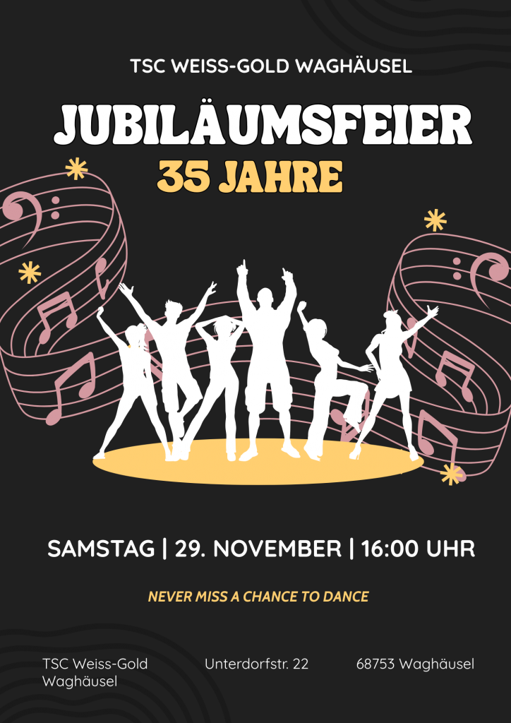 35 Jahre ist es nun her, seit die Tore des Tanzsportclubs Weiss-Gold Waghäusel zum ersten Mal öffneten. 35 Jahre, in denen unsere Räume von unzähligen Liedern und tanzbegeisterten Menschen belebt wurden.